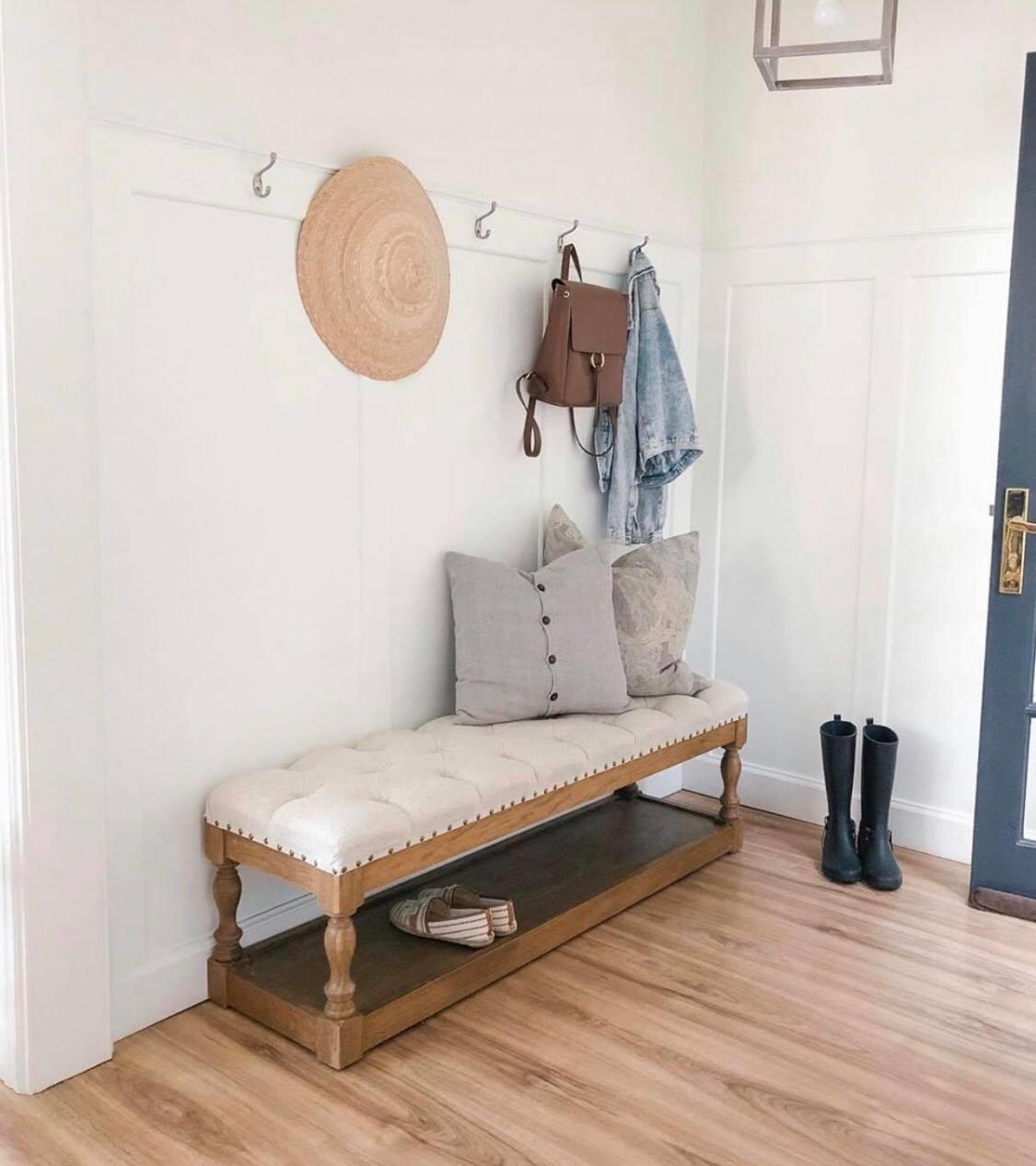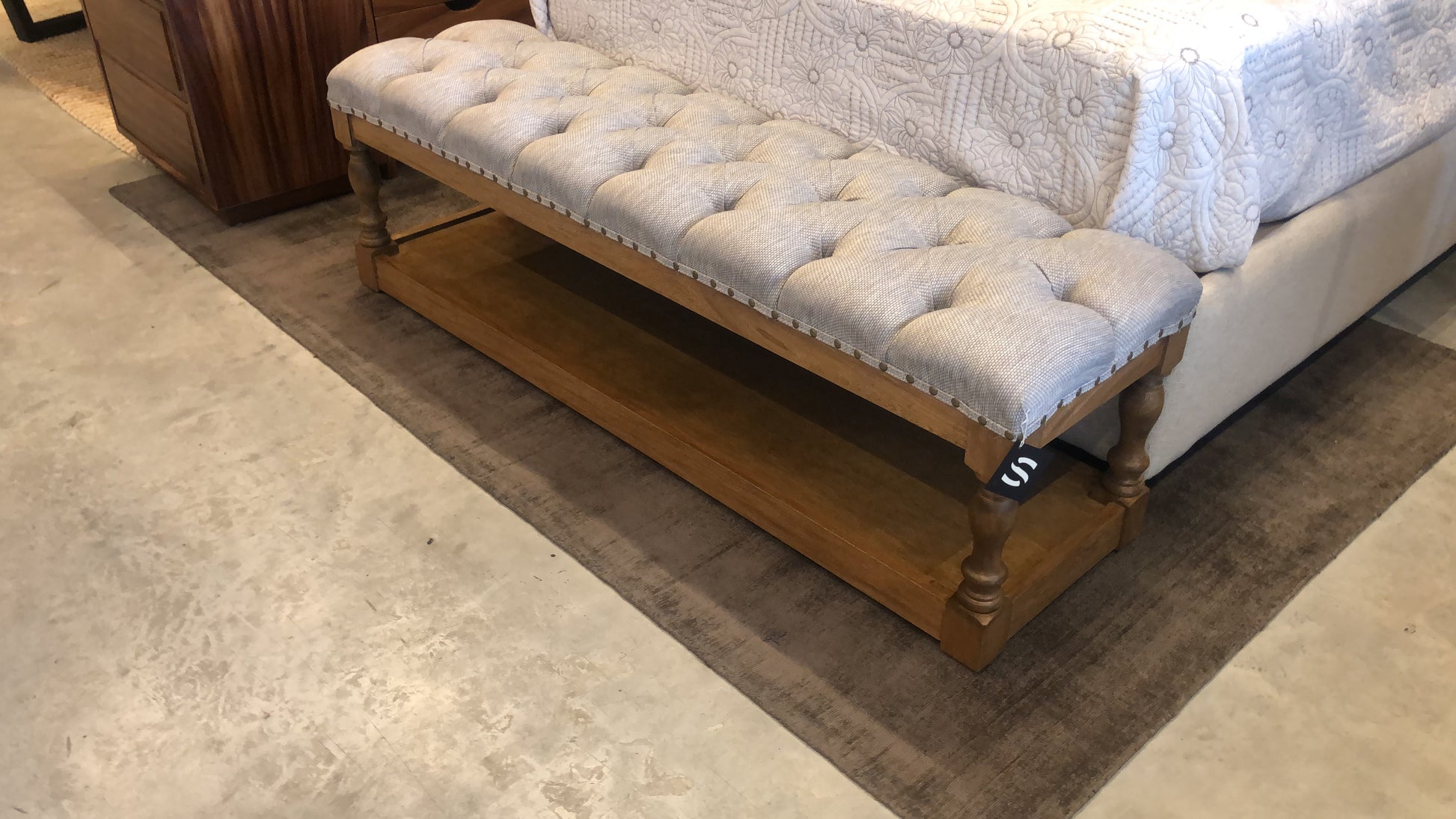 Banca tapizada capitonada o lisa, puede usarse como auxiliar de sala, también puede utilizarse como pie de cama. Repisa estructura de roble con patas torneadas. Tres plazas. Por dentro: hule espuma de alta densidad y delcrón.