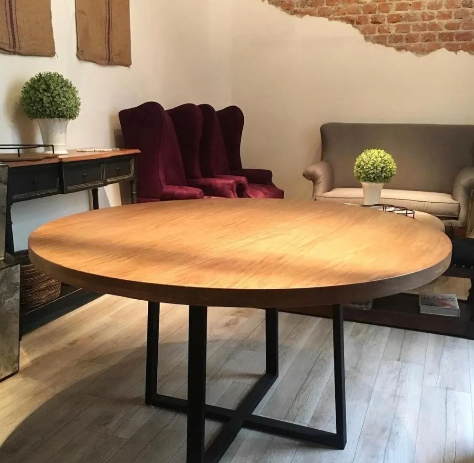 Mesa de comedor redonda con madera fina de roble y estructura de hierro